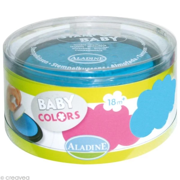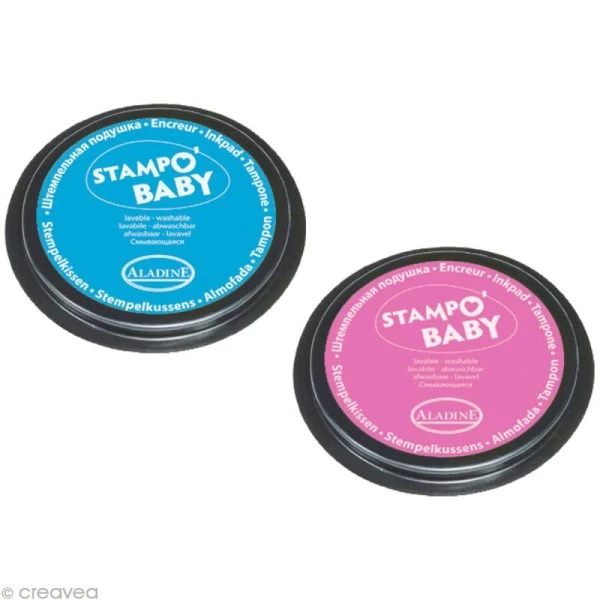 Ensemble de 2 gros encreurs bleu turquoise et rose Stampo’baby spécialement formulés pour une utilisation par de jeunes enfants. Les encreurs géants Stampo baby Turquoise / rose (10 cm) peuvent être utilisés avec toutes sortes de tampons. L’encre est à base d’eau, est lavable et non toxique. Idéale pour initier les tout petits à la création, les 2 encreurs bleu turquoise et rose permettront des activités ludiques dès 18 mois !