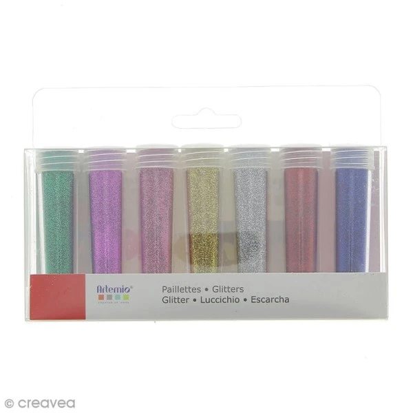 Assortiment de 7 petits pots de paillettes fines dans différents colorisvert, rose fuchsia, rose, jaune doré, gris argenté, rouge et bleu.