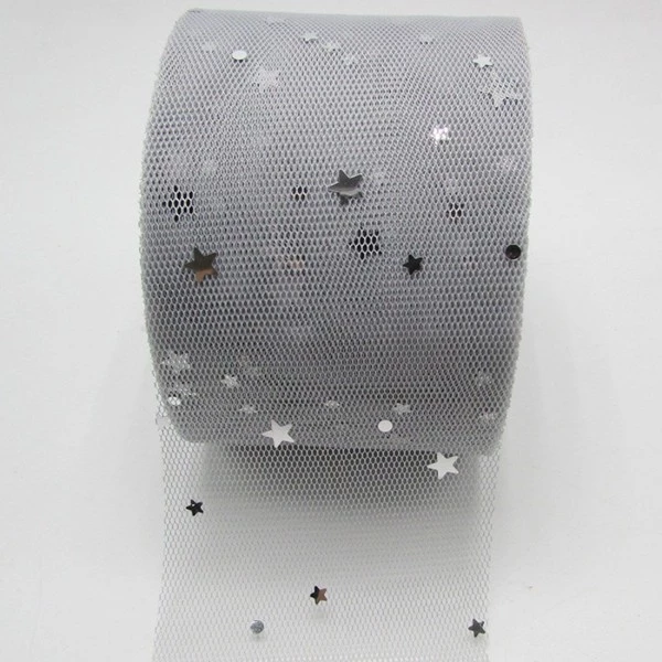 Description de 5yrd 15ft 4,5 m d’Argent de Tissu de Dentelle de Gaze de Ruban de finition Avec des Paillettes Étoil