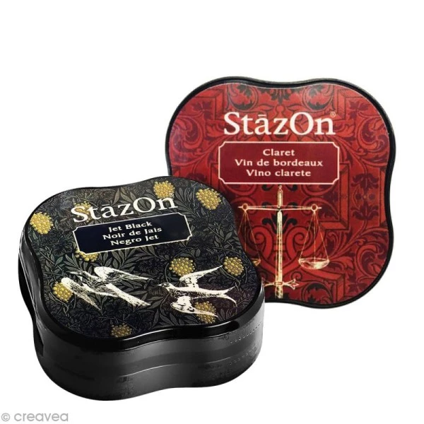 L’encre StazOn est une encre permanente à colorant mélangée à un solvant. Le coussin encreur fait 3,8 x 3,8 cm.
