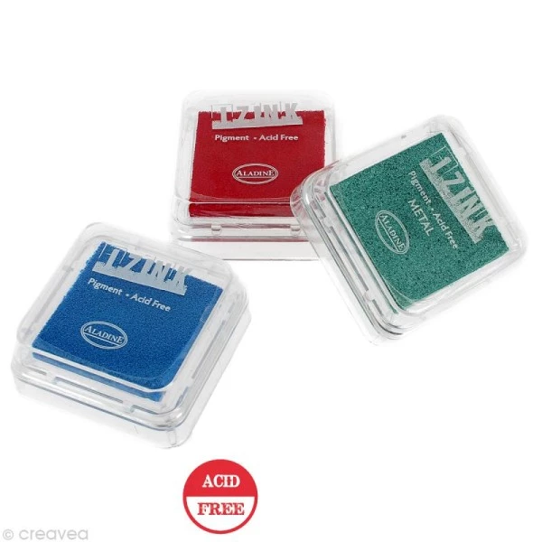 L’encreur Izink d’Aladine sera votre nouveau allié en scrapbooking et carterie ! 36 couleurs différentes sont à votre disposition, avec ou sans effet (métallique, fluo). L’encre Izink est très pigmentée et intense en couleur, ce qui vous permettra de travailler sur des supports foncés. Elle est aussi sans acide et nécessite d’être embossée. Le coussin encreur fait 3,5 x 3,5 cm et est protégé par une boîte en plastique transparent qui vous permettra d’identifier le coloris rapidement à l’oeil.