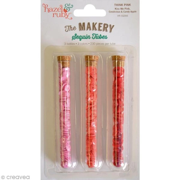 Très polyvalents, les sequins Think pink vous sont livrés dans des tubes transparents fermés par un bouchon en liège. Vous pourrez compter environ 230 paillettes par tube pour chaque couleur.
