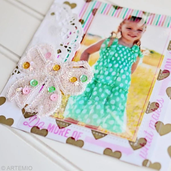 Vous pourrez parfaitement réaliser de somptueuses broderies sur un sweat, un sac ou des chaussures en toile, les piquer pour décorer un support en polystyrène ou bien encore les coller sur une carte ou une page de scrapbooking.