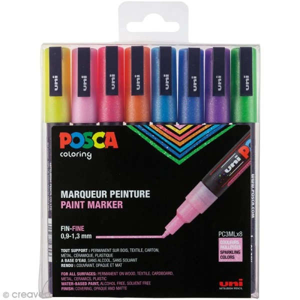 Description de Coffret de Feutres Posca Pailleté PC-3M – Couleurs assorties – 8 pcs