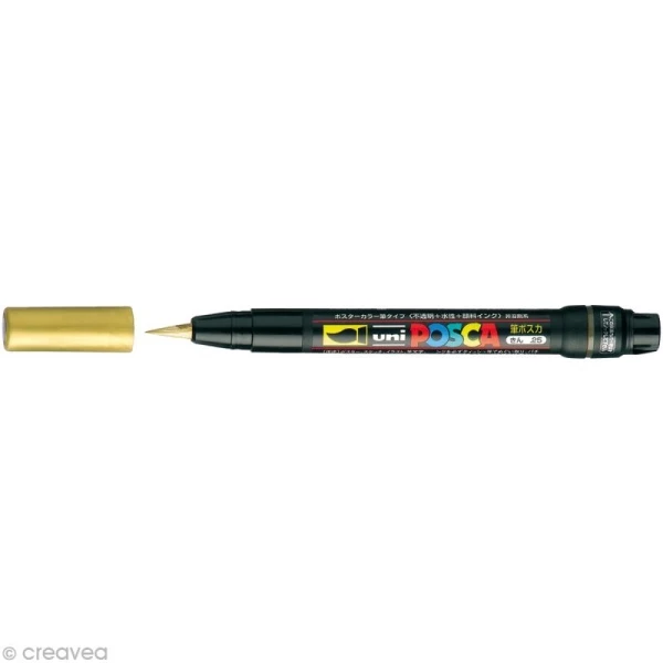 Le marqueur pinceau Posca Or est un feutre de peinture à base d’eau. Il est particulièrement utilisé pour dessiner, colorier, et customiser, en particulier dans les loisirs créatifs. La peinture contient des pigments qui rendent des couleurs durables et lumineuses.