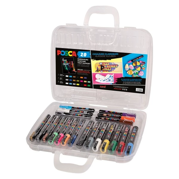 Mallette contenant un assortiment de 20 marqueurs Posca de différentes couleurs et calibres pour tous vos besoins créatifs. Ces marqueurs multi-supports à base d’eau et de pigments inaltérables sont les alliés des artistes et décorateurs. Vous trouverez dans cette mallette Posca :