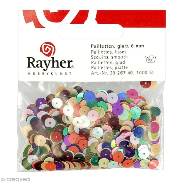 Ces 1000 sequins plats de couleur Multicolore métallisé (diam 6 mm), sont idéalement conçus pour décorer les objets en polystyrène et agrémenter vos créations de couture. Très pratique et simple à utiliser, chaque sequin plat est perforé en son milieu pour vous permettre de les épingler facilement sur votre support semi rigide (polystyrène, carton, papier mâché, etc.) grâce aux épingles à sequin.