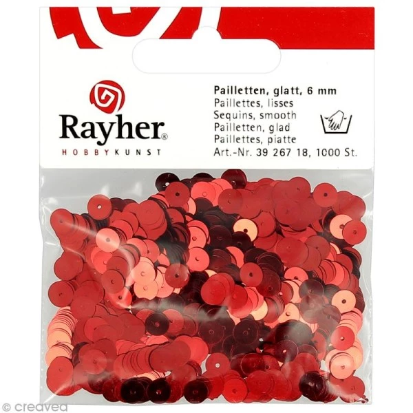 Ces 1000 sequins plats de couleur Rouge métallisé (diam 6 mm), sont idéalement conçus pour décorer les objets en polystyrène et agrémenter vos créations de couture. Très pratique et simple à utiliser, chaque sequin plat est perforé en son milieu pour vous permettre de les épingler facilement sur votre support semi rigide (polystyrène, carton, papier mâché, etc.) grâce aux épingles à sequin.