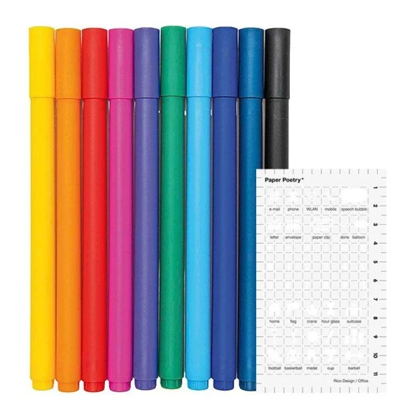 Ces stylos roller en gel et son pochoir de chez Rico Design sont vos meilleurs alliés pour décorer votre bullet journal et tous vos carnets ! Cet ensemble est composé de 10 stylos violet, rouge, orange, jaune, vert, bleu, noir et rose ainsi qu’un pochoir pour créer à l’infini ! La pointe du stylo est de 0.4 mm.
